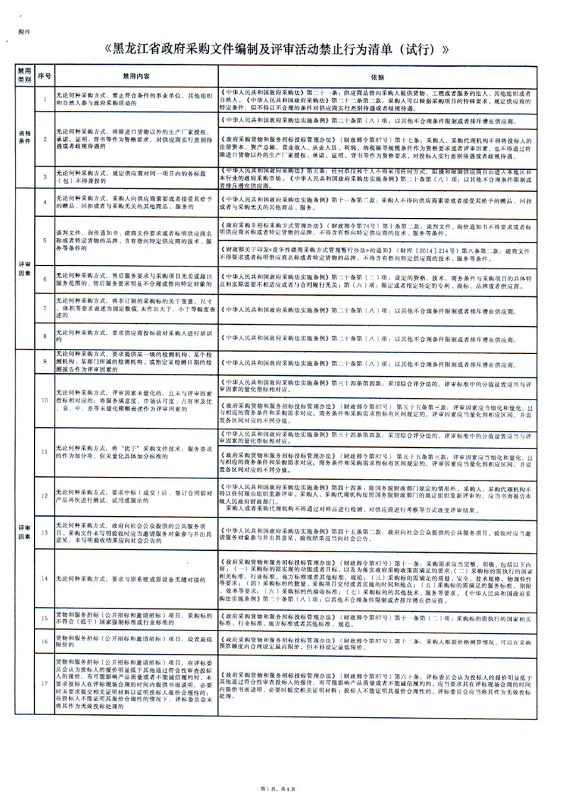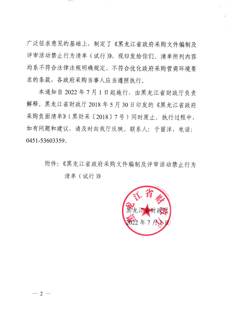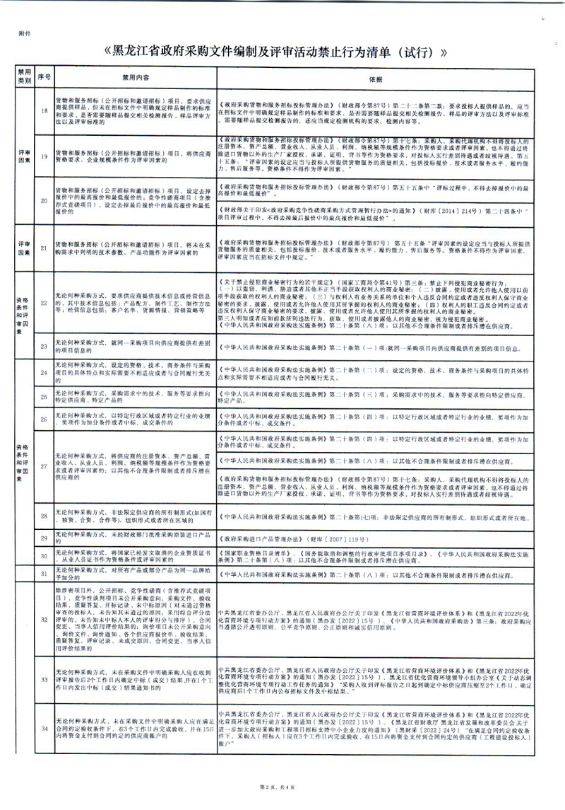 黑龙江省财政厅关于印发《黑龙江省政府采购文件编制及评审活动禁止行为清单(试行)的通知》 (黑财规审〔2022〕10号)